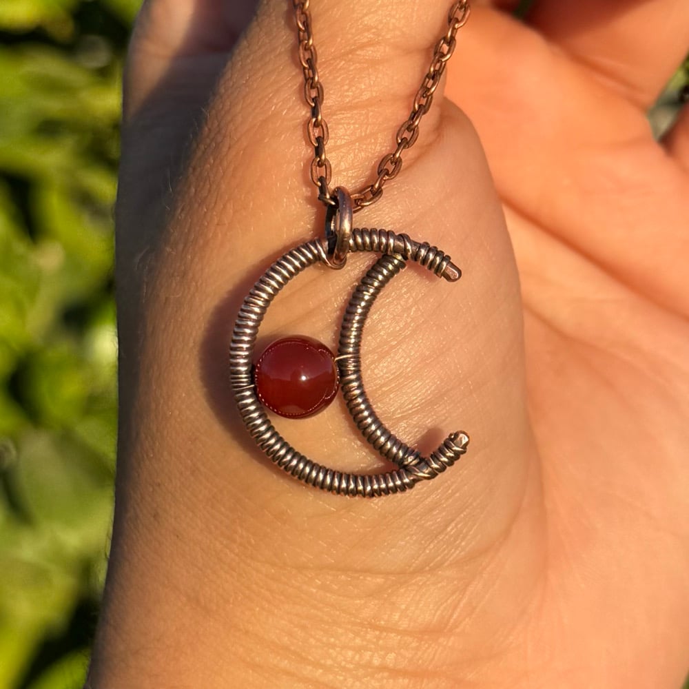 Carnelian Copper moon pendant πβ€οΈβπ₯ This pendant was both metalmsithed & wire wrapped using solid, antiqued copper wire π€