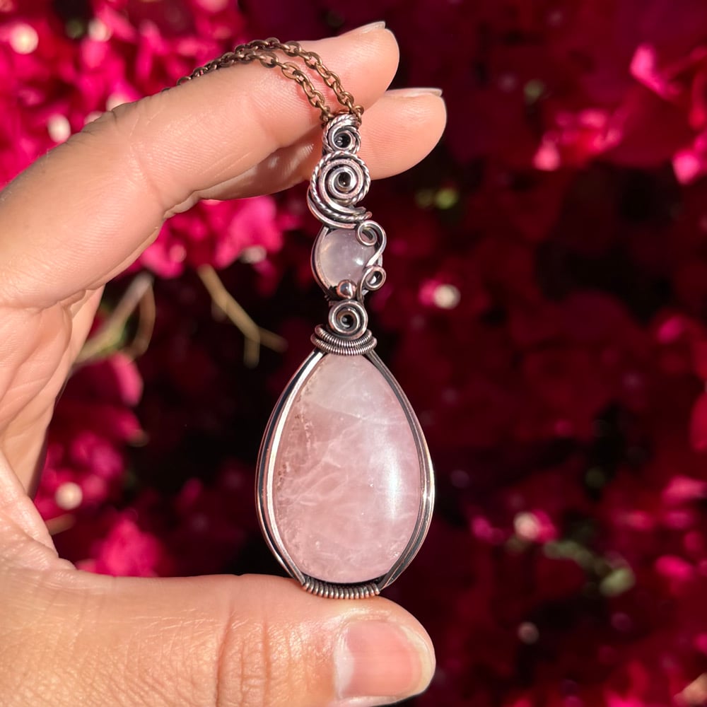 Double Rose Quartz pendant π Created using antiqued copper wire π