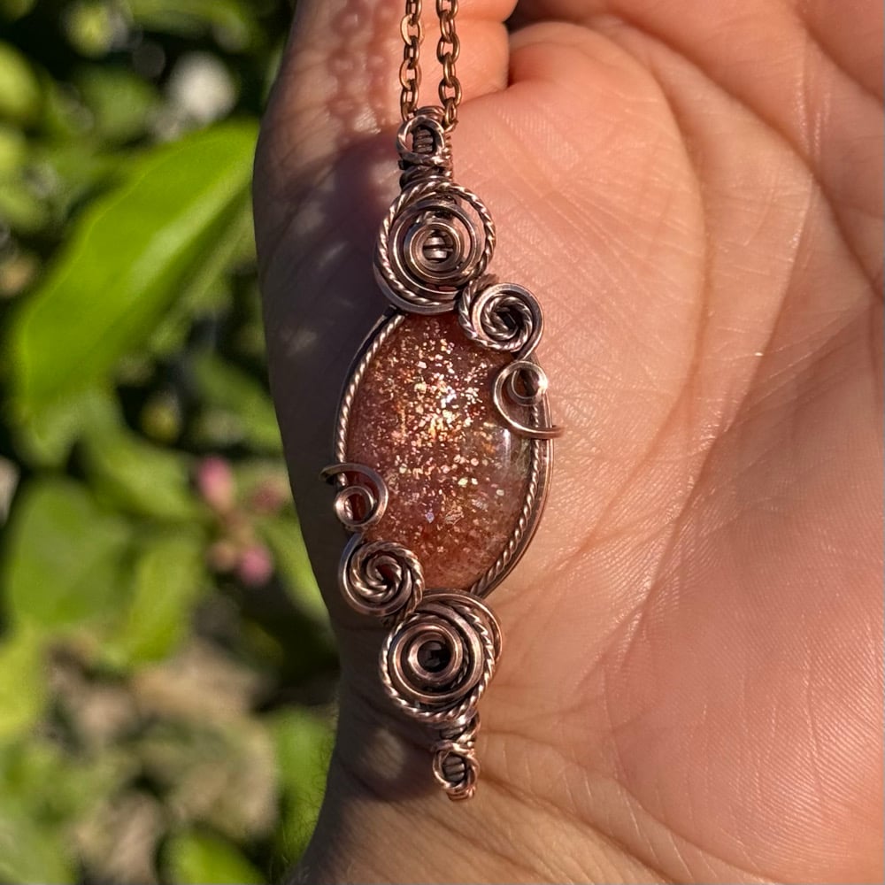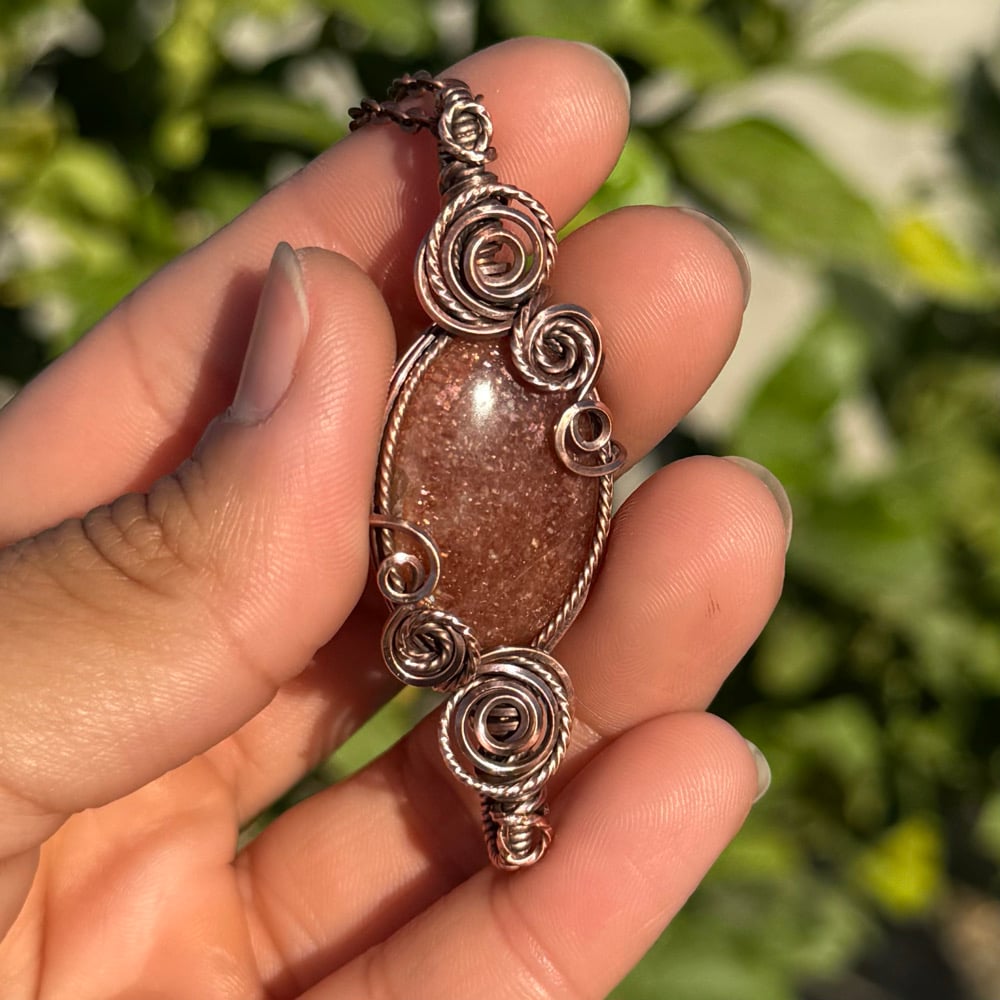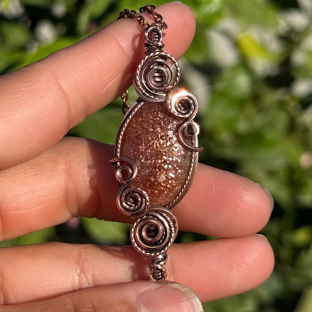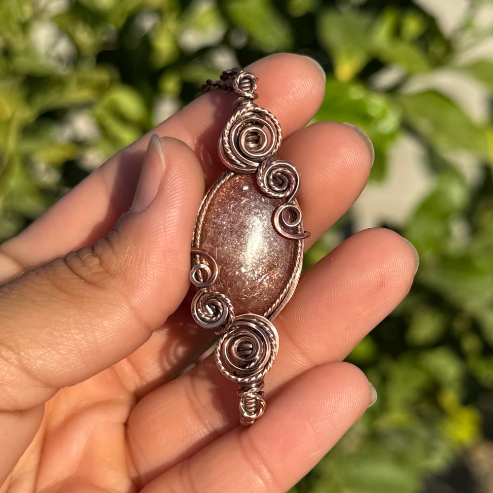 Very sparkly Sunstone wrapped in a double swirl pendant design π§‘β¨