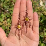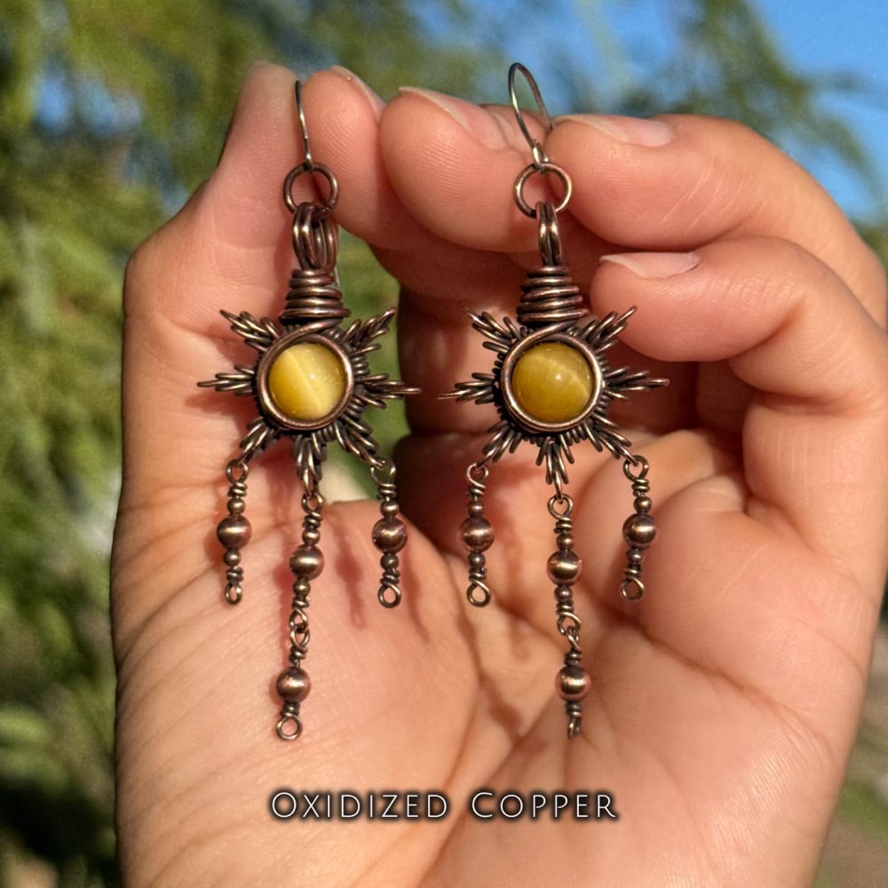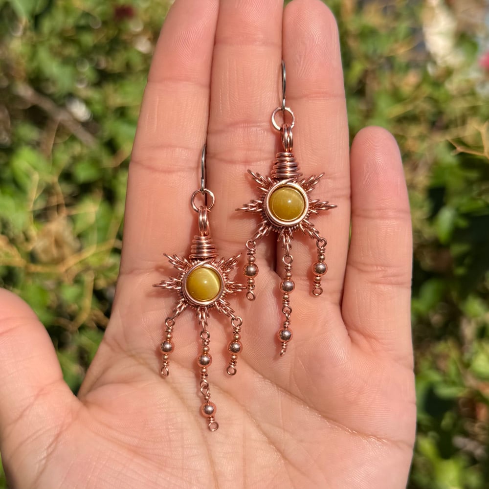 Golden Tigers Eye sun earrings with copper bead dangles βοΈπ These Earrings are hand wrapped using bare (or oxidized) copper wire π