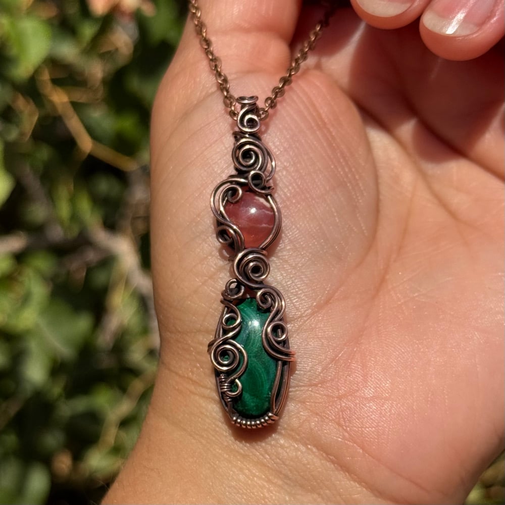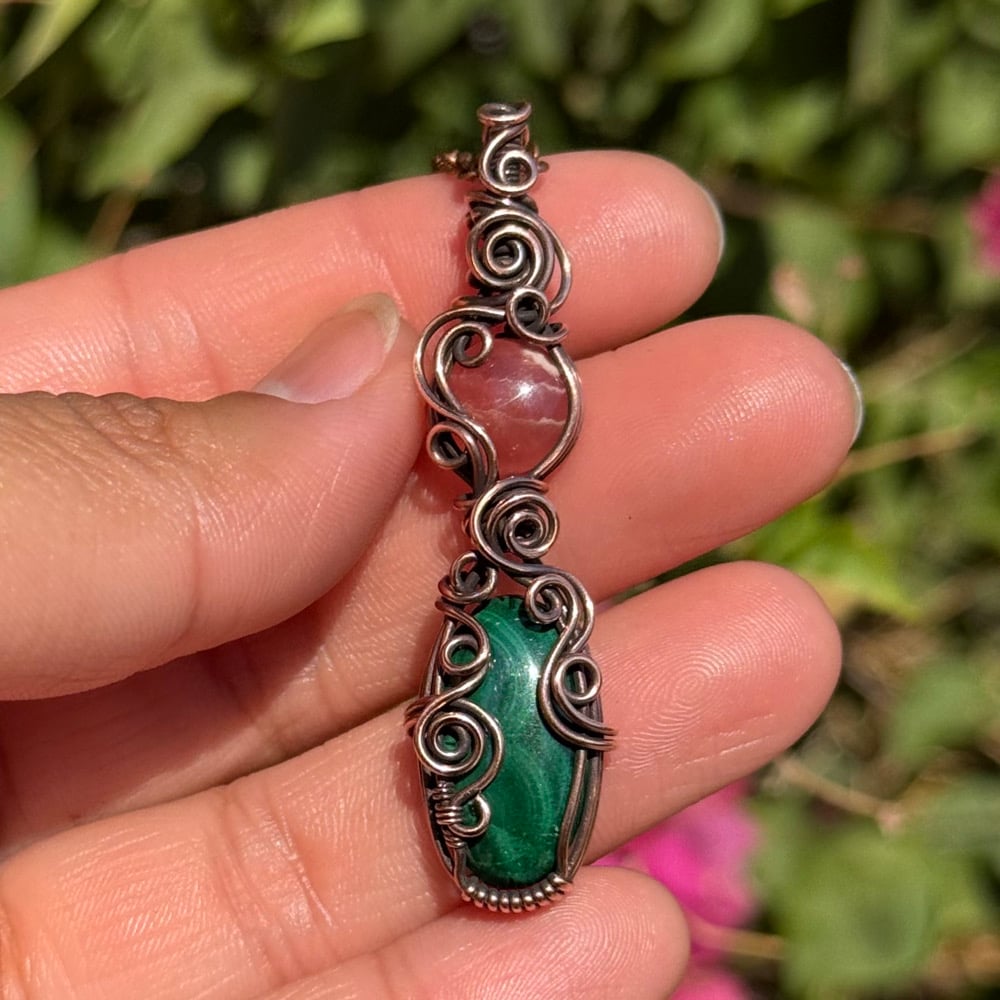rhodochrosite (top) & malachite (bottom) wrapped in a swirly, antiqued copper design ππ