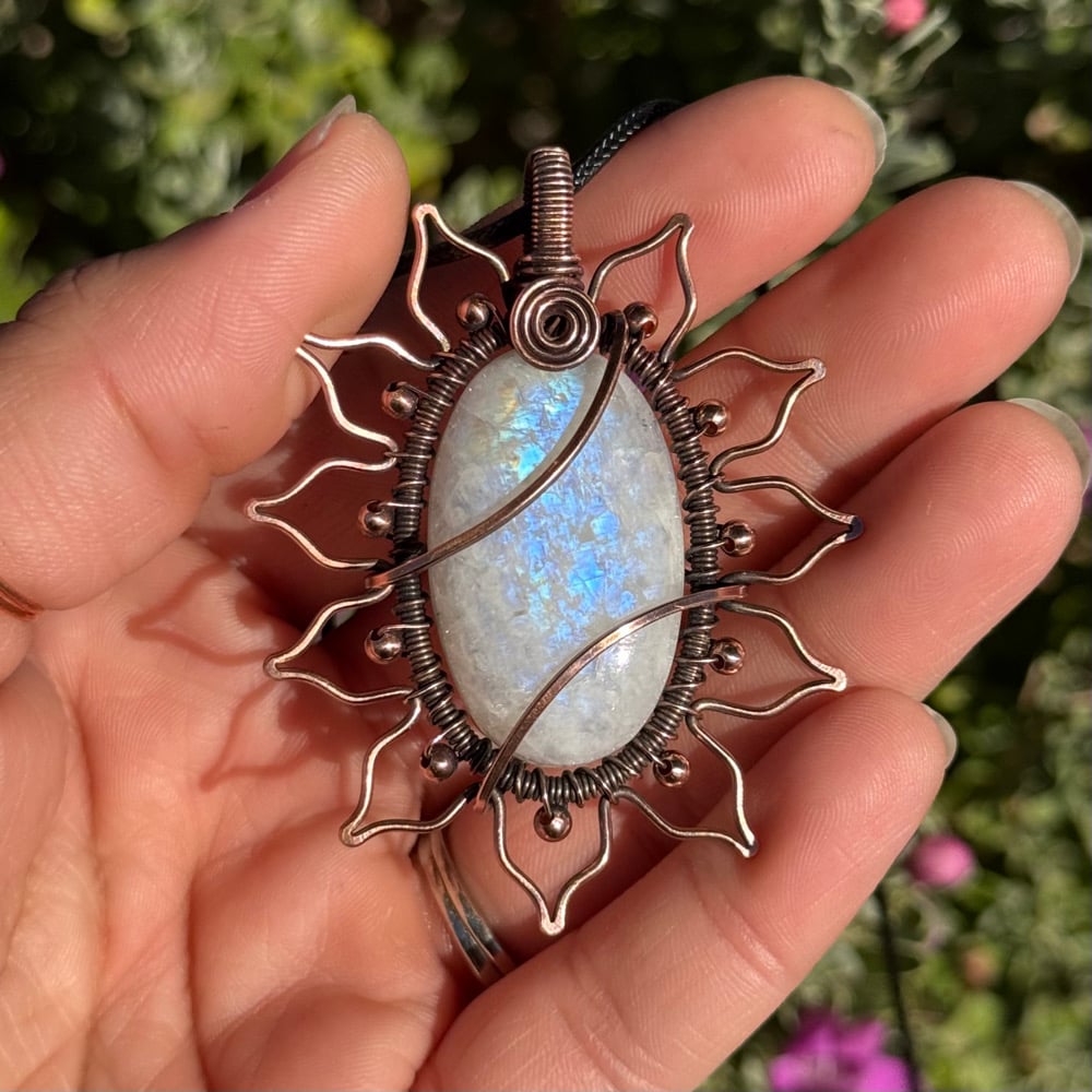 Rainbow Moonstone with beautiful blue flash, wrapped in an antiqued copper sun/flower design π»π€