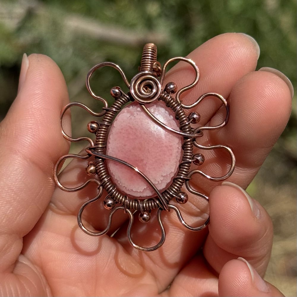 Rhodochrosite pendant wrapped in an antiqued copper, flower design πΈπ