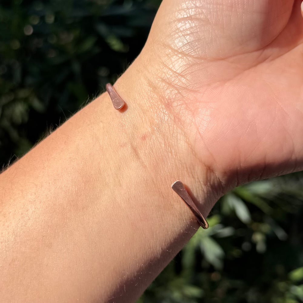 Solid, sleek, bare copper cuff(s) that has been measured, hammered, bent & shaped by hand π€